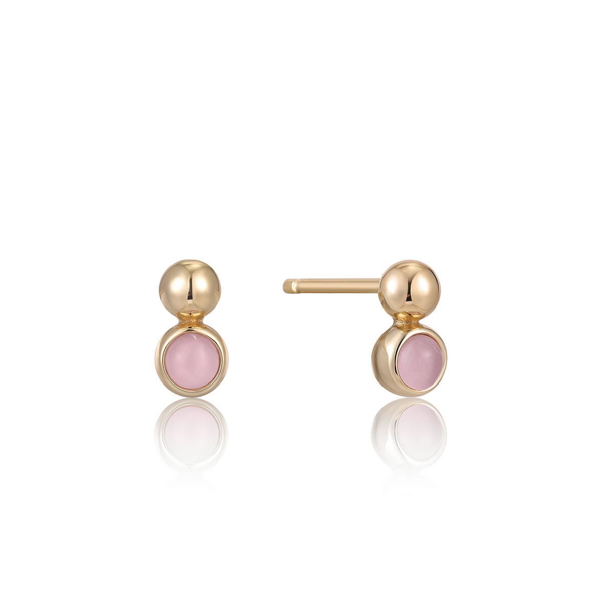 El disseny presenta una petita boleta daurada que envolta una pedra de quars rosa brillant, aportant un subtil reflex rosat que realça qualsevol estil amb delicadesa.
