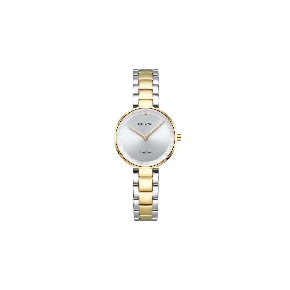 El Bering Classic 17529-710 és un rellotge femení que destaca pel seu disseny minimalista i elegant. La seva caixa rodona d’acer inoxidable de 30 mm de diàmetre presenta un acabat en or polit que aporta sofisticació. L’esfera platejada amb acabat sunburst està protegida per un cristall de safir pla, conegut per la seva alta resistència als ratllats. Un diamant genuí a la posició de les 12 hores afegeix un toc de luxe discret.