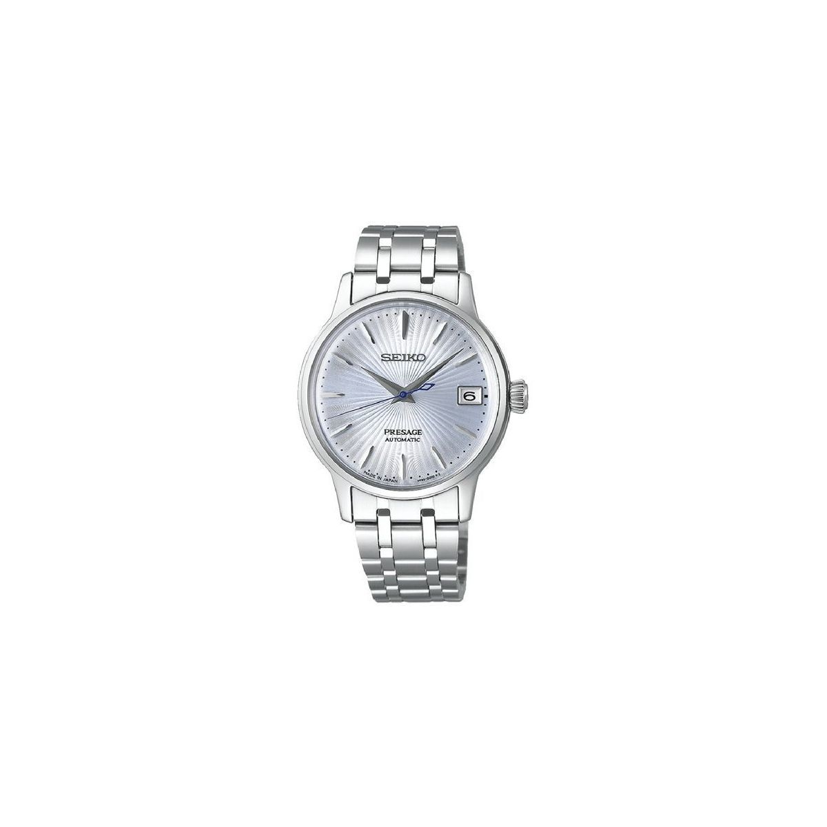 Seiko Presage Cocktail amb moviment automàtic i analògic, caixa d'acer de 33.8mm, braçalet d'acer, esfera en color plata, fons de caixa transparent roscat, cristall Hardlex, amb funció de calendari, resistent a l'aigua fins a 50 metres.