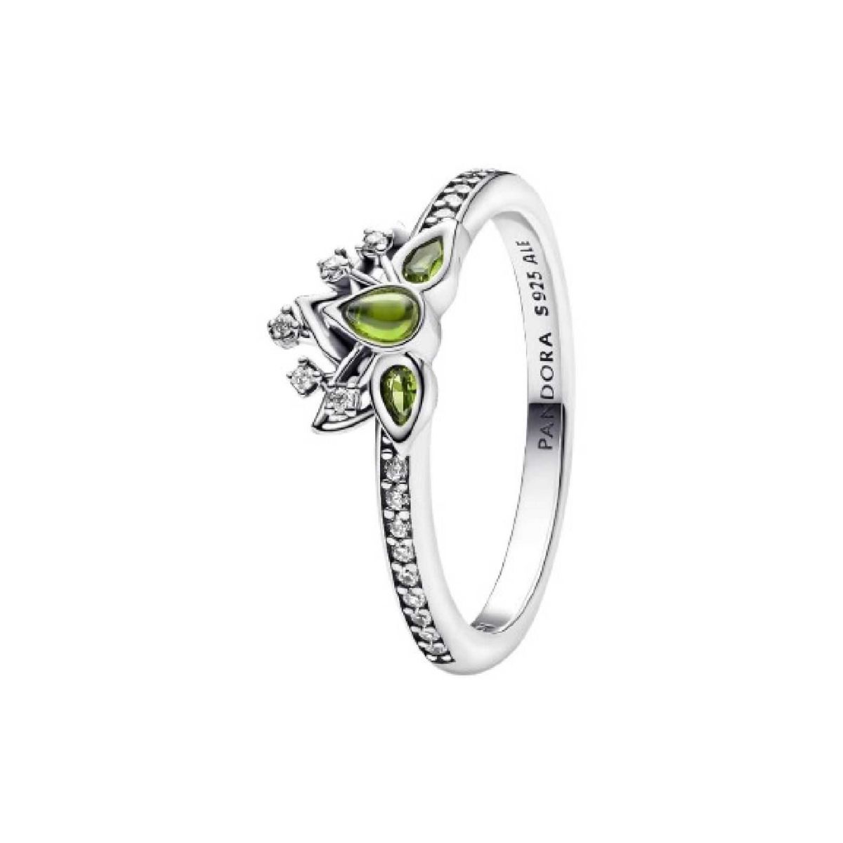 Este anillo de Princesas de Disney recrea la tiara de Tiana, adornado con tres cristales verdes en forma de pera que evocan un delicado nenúfar. Lleva contigo la energía de una princesa todos los días con este diseño único