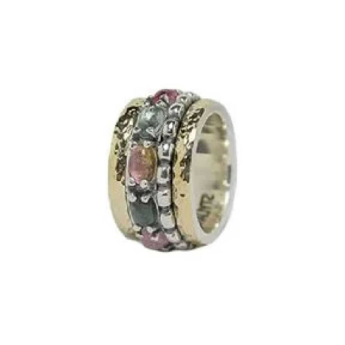 Anillo artesanal de oro y plata con turmalinas multicolores. Diseño audaz y elegante, con textura martillada y detalles únicos.