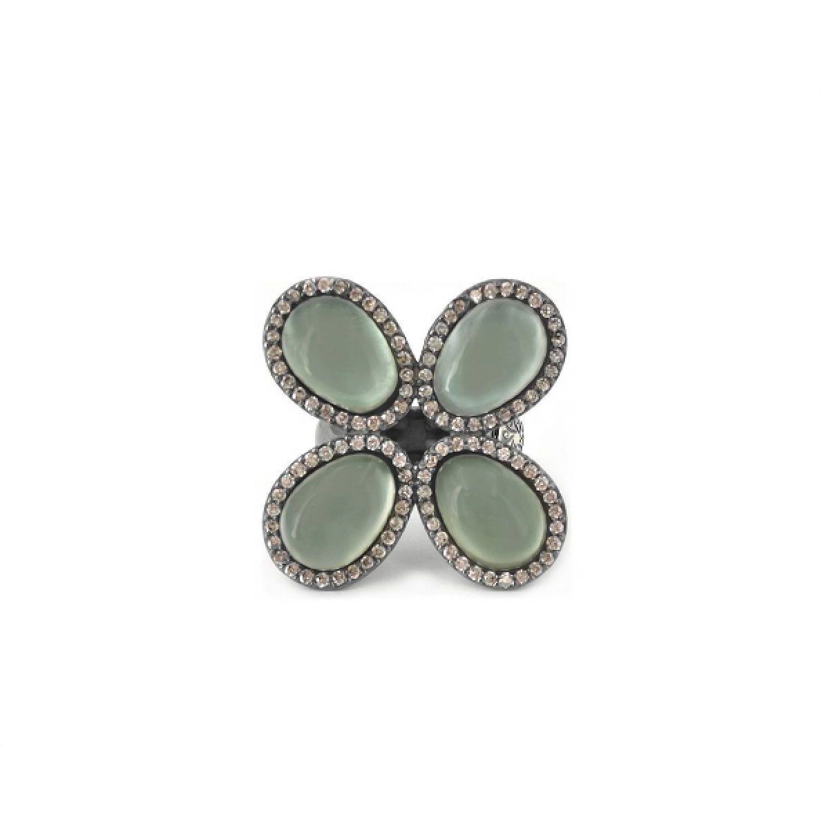 Anillo llamativo y elegante con diseño en forma de flor, compuesto por cuatro olivinas en talla cabujón, enmarcadas por circonitas en tono champán. Montado en plata de ley con detalles en oro de 18K, es una joya sofisticada que combina fuerza y feminidad.