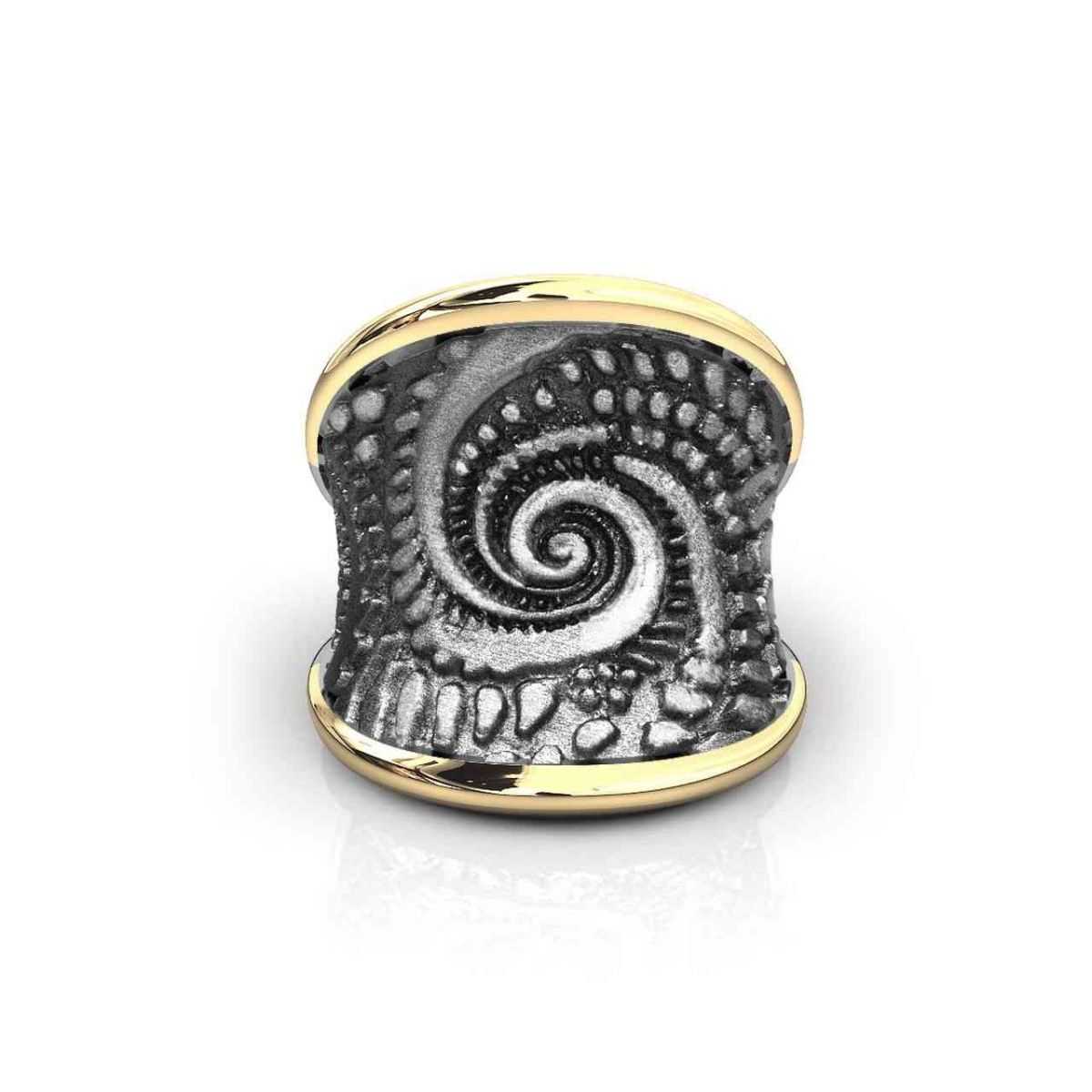 Anillo Bohemme de la colección Ammonites Again, elaborado en plata de ley 925 con detalles en oro amarillo laminado de 18K. Su diseño en espiral, inspirado en las formas naturales de los ammonites, combina texturas y contrastes con un elegante acabado oscuro que resalta los relieves dorados.