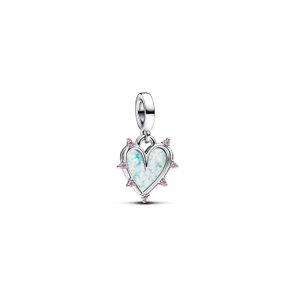 Charm Colgante Doble en plata de primera ley Amistad Opalescente adornado con siete circonitas cúbicas rosas de talla brillante y un ópalo rosa plano artifical en forma de corazón