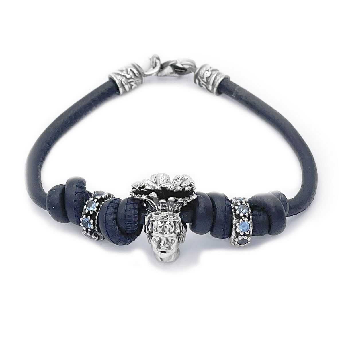 Pulsera Gegant Indi de Reus con Abalorios de la colección 'Séquito de Reus' exclusiva de Rovira Joiers, charm realizado en plata, abalorios realizados en plata y circonitas azules , pulsera de cuero en color negro con cierre magnético.