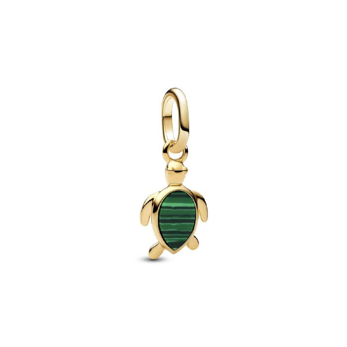 Charm inspirado en una tortuga, símbolo de longevidad y paciencia, con malaquita sintética y detalles intrincados que lo hacen único.
