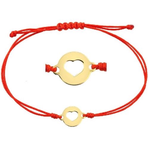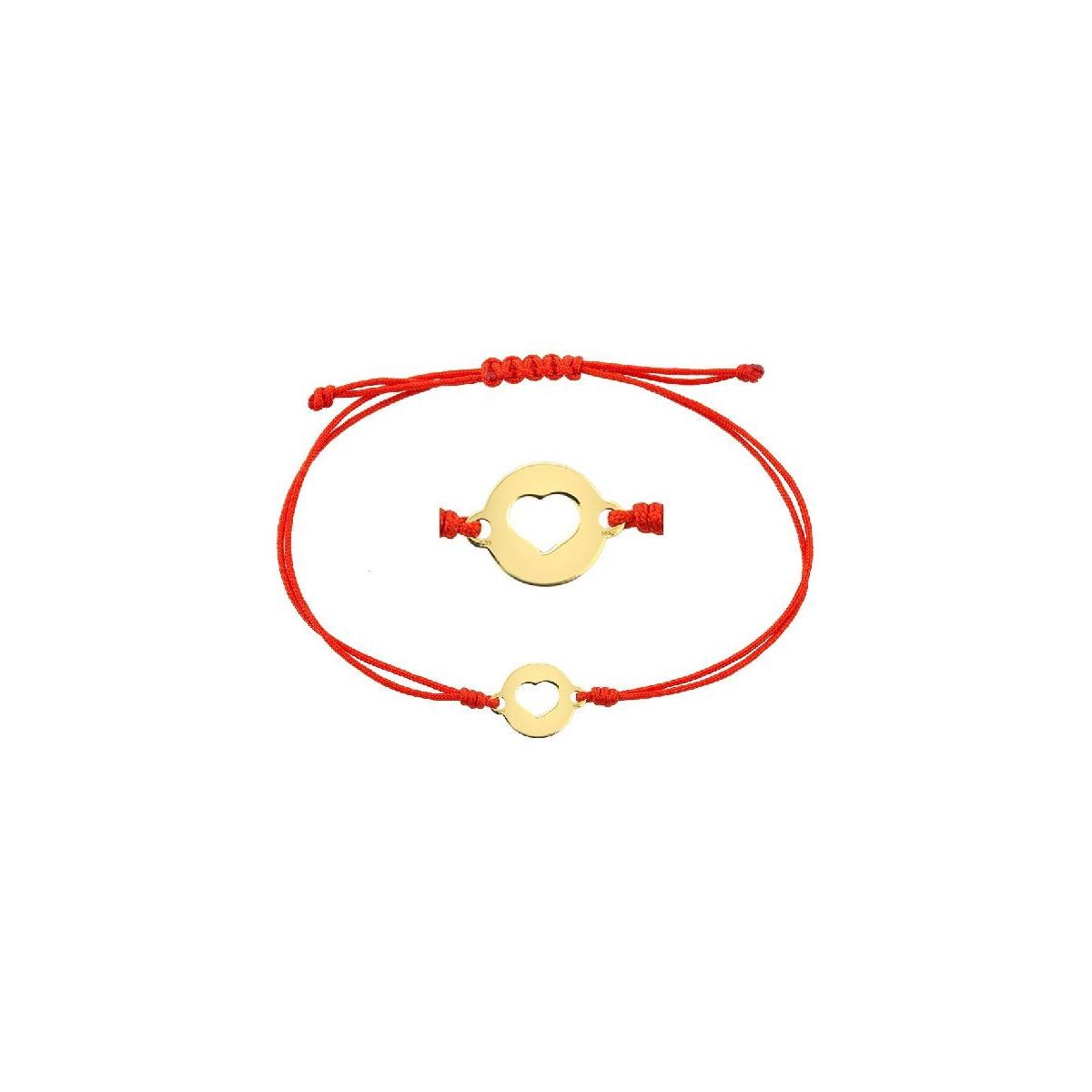 Pulsera ajustable con cordón rojo y medallón en oro amarillo calado con un corazón. Un accesorio elegante y simbólico para expresar amor y protección.