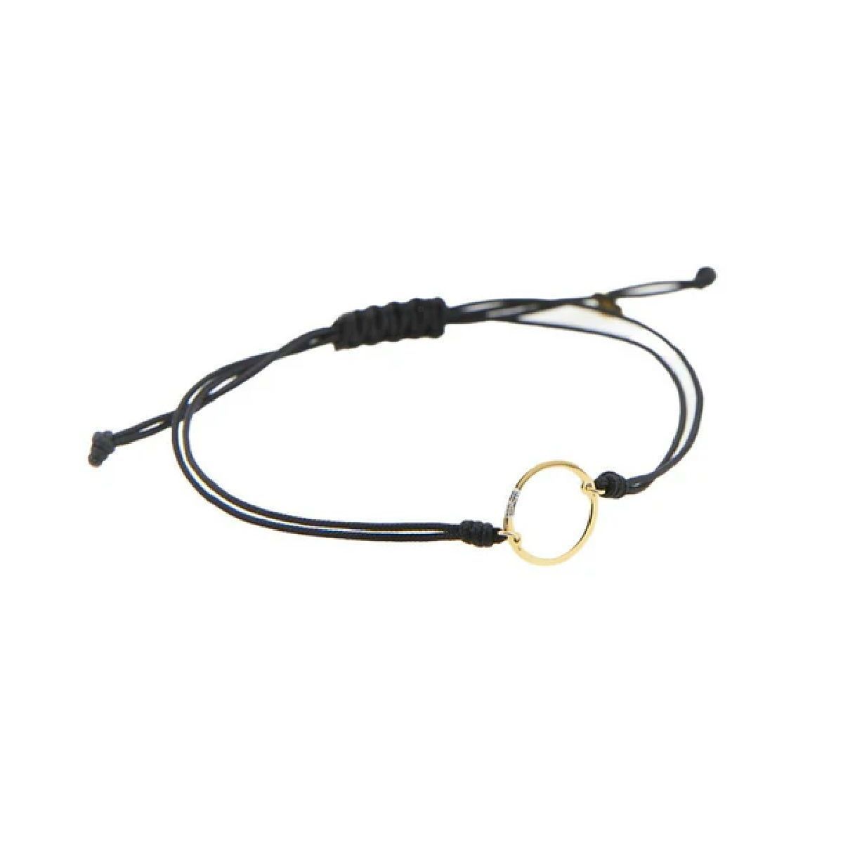 Sencillez y elegancia se unen en esta pulsera minimalista de diseño atemporal. Confeccionada con un delicado aro de oro que simboliza la eternidad y el equilibrio, esta pieza se complementa con un resistente cordón de nailon negro ajustable, lo que la hace cómoda y versátil para el uso diario.