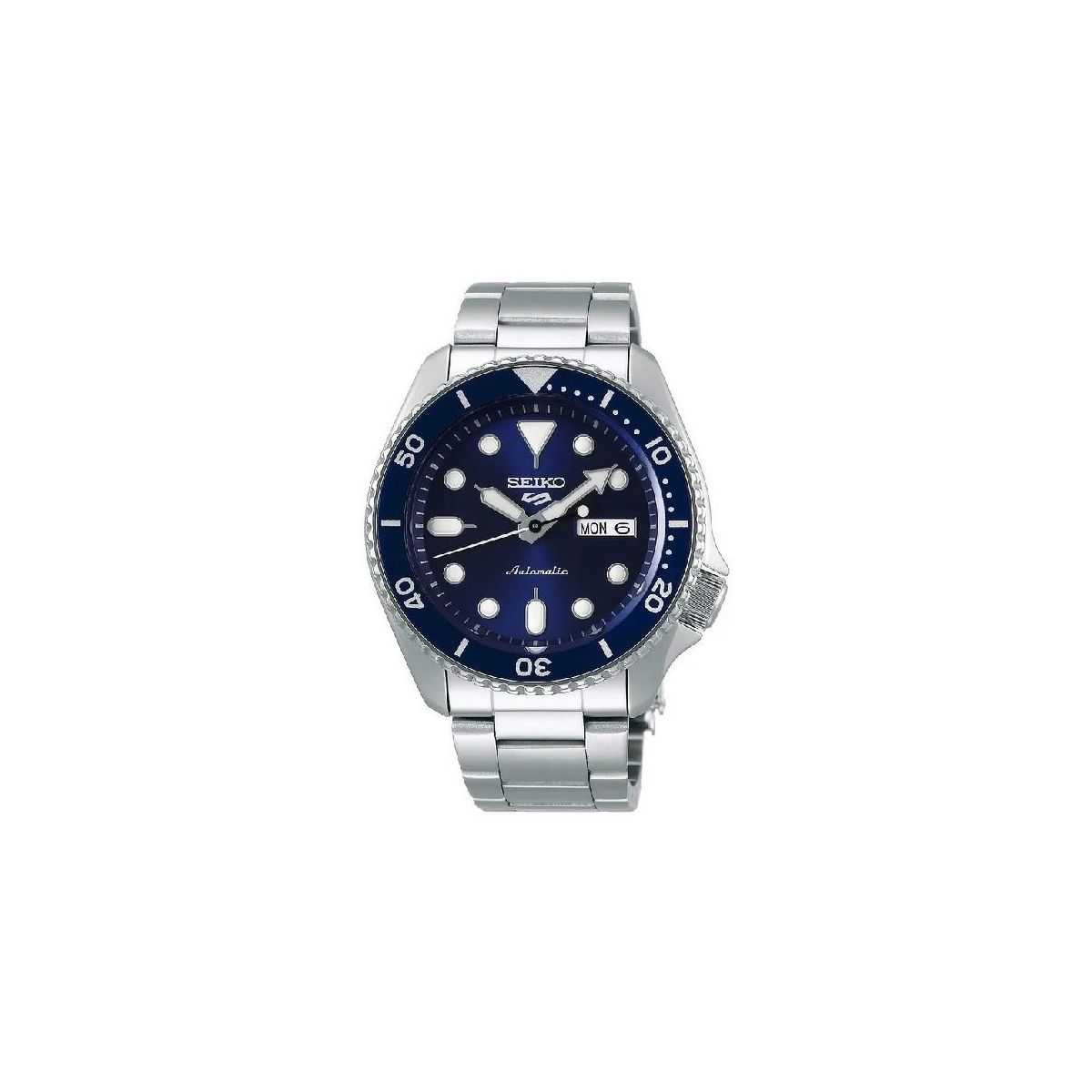 El Seiko 5 Sports es un reloj automático para hombre con caja de acero inoxidable de 42.5 mm, esfera azul con acabado sunray y bisel giratorio unidireccional.
