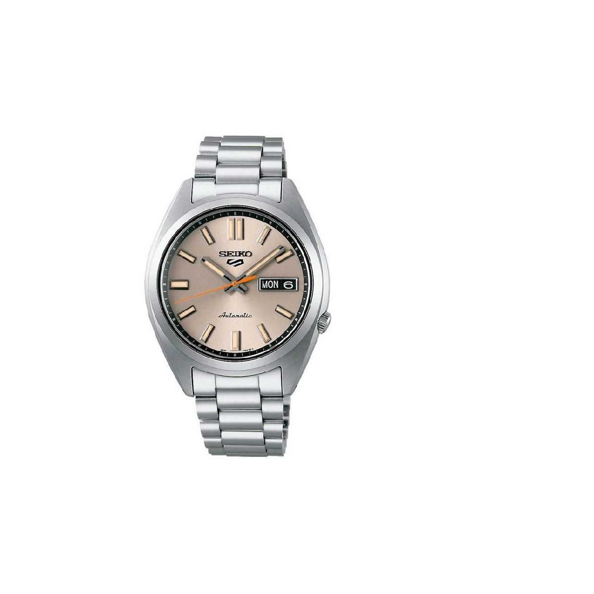 La esfera color champán sunray, realzada por un segundero naranja muy retro y índices/marcas diamantadas, refleja a la perfección la herencia relojera de Seiko. Las manecillas anchas y los índices aplicados están recubiertos con LumiBrite, garantizando una excelente visión en la oscuridad.
