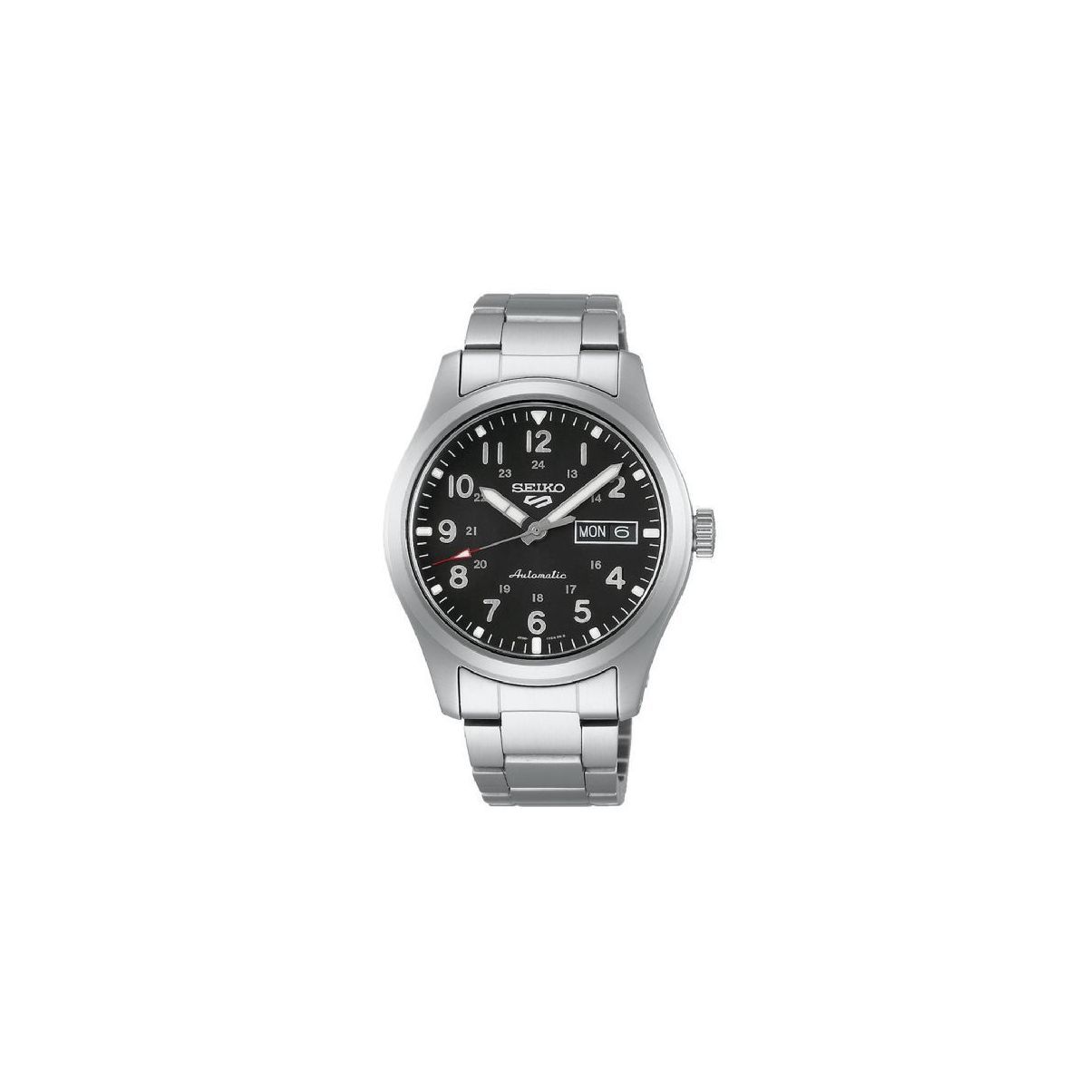 Seiko 5 Sports Field Military Sports con movimiento automático, caja de acero de 39.4 mm, brazalete de acero, esfera en color negro, fondo de caja transparente roscado, cristal Hardlex, con función de calendario, resistente al agua hasta 100 metros.