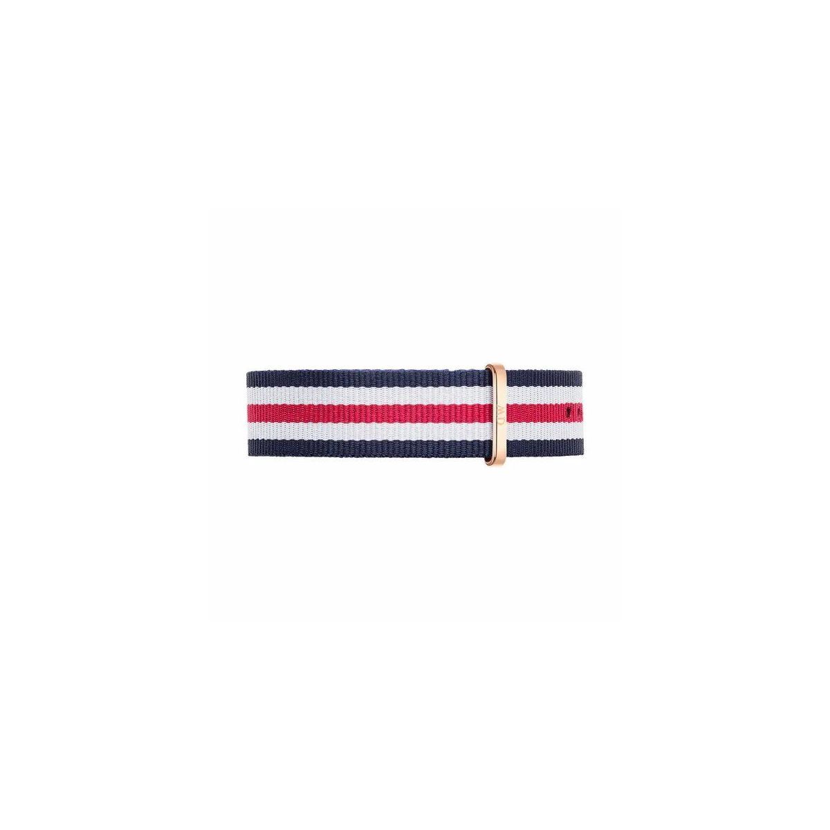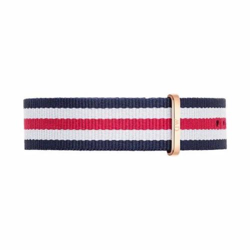 El modelo Daniel Wellington Classic 20 Canterbury es una correa NATO de nailon con hebilla en oro rosado, diseñada para relojes de 20 mm de ancho. Esta correa presenta una combinación de colores azul marino, blanco y rojo, evocando un estilo náutico y preppy. La hebilla en tono oro rosado añade un toque de elegancia y contraste al diseño.